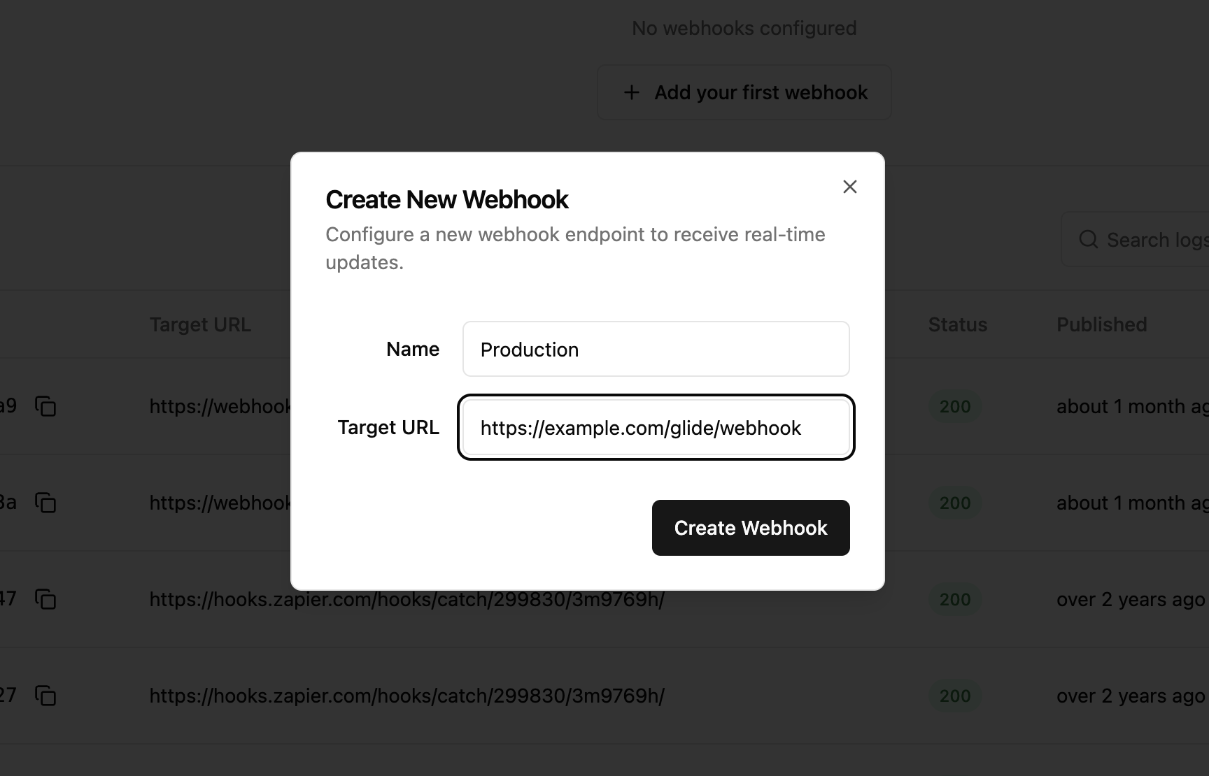 Head over to the Webhooks page in Glide Dashboard and add a webhook pointing to your server. Now, you will receive webhooks like so: